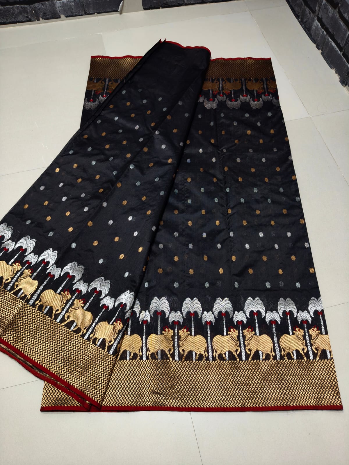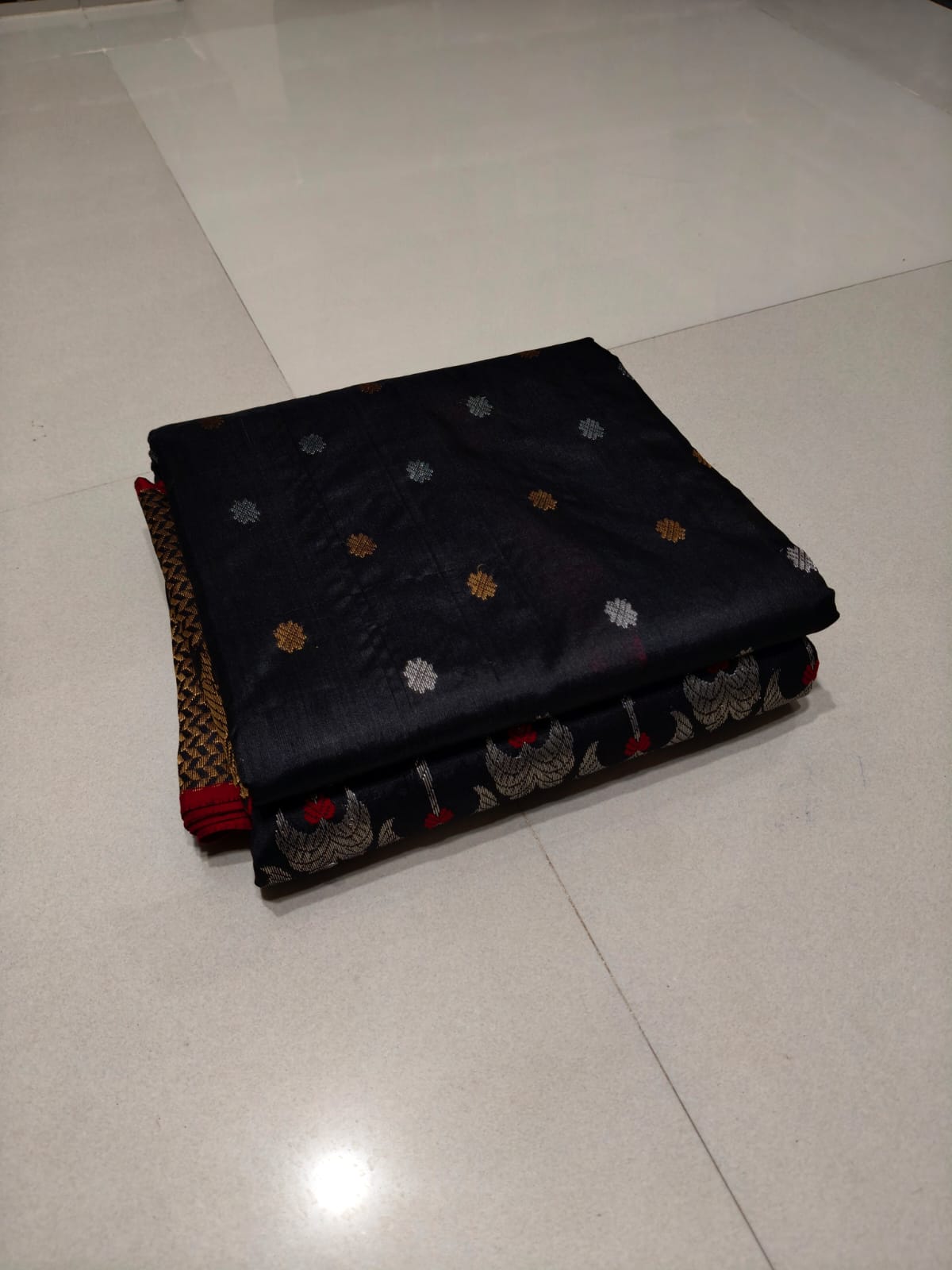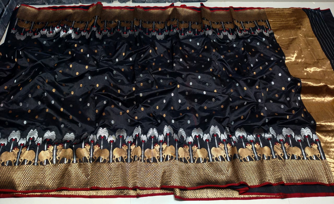 - Border: Minakari-style cow floral weaving, a nod to regal craftsmanship