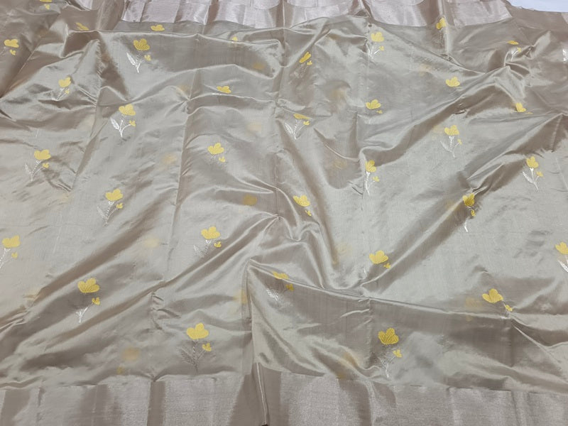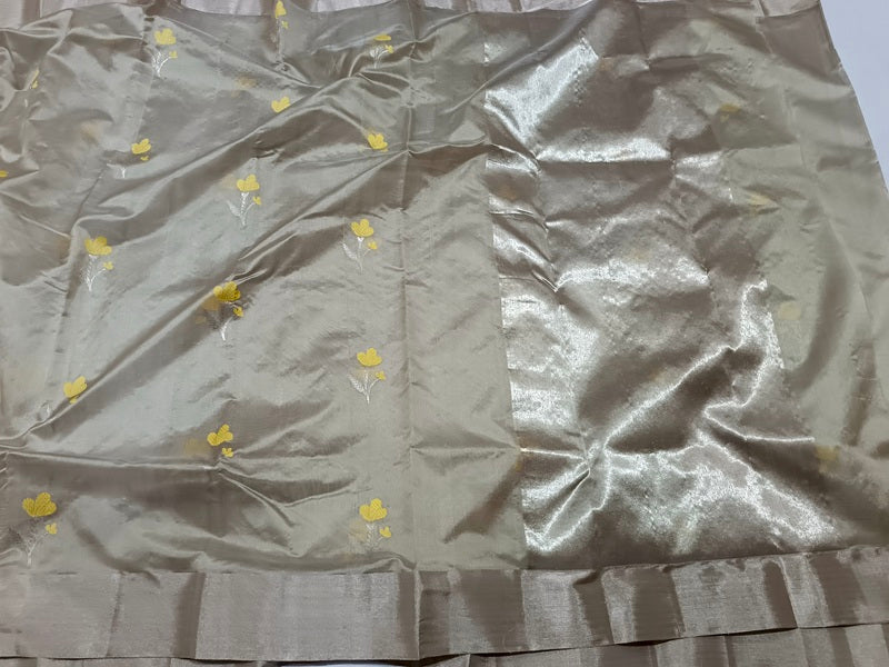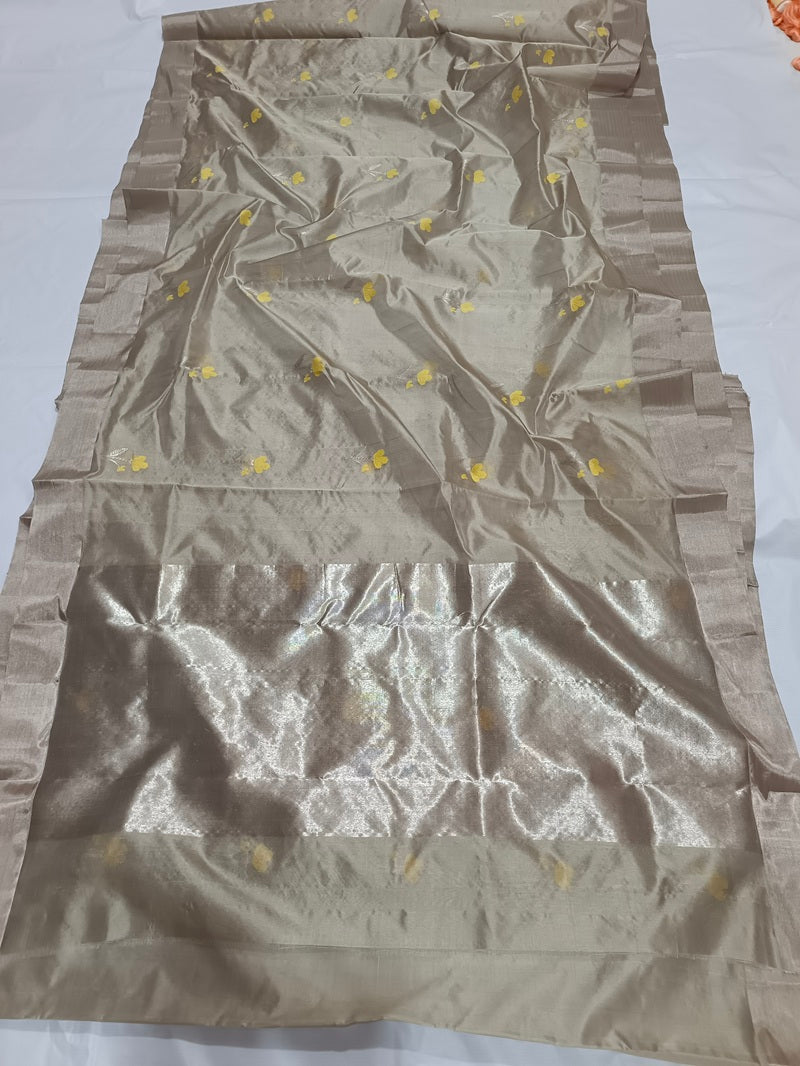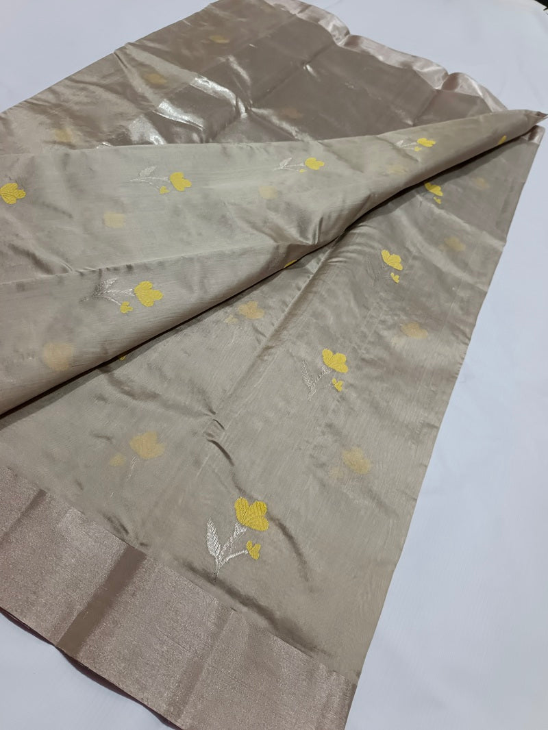Experience timeless elegance with this flower Designer Chanderi Pure Pattu Silk Saree, a luxurious drape that blends heritage craftsmanship with refined design. Made from premium pure pattu silk, the saree features all-over flower Minakari buttis, intricately woven to reflect nature’s grace and artisanal finesse.