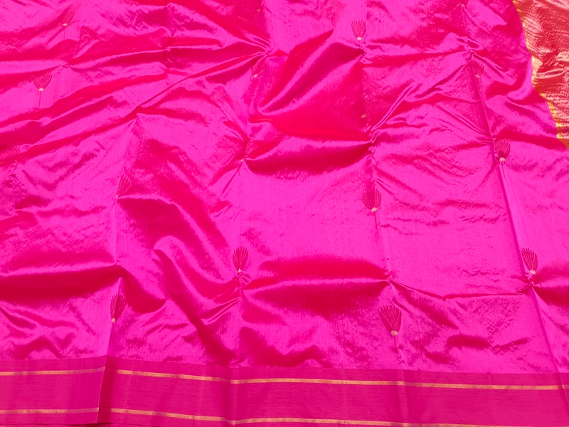 Celebrate timeless elegance with the Padma Tarang Designer Chanderi Pure Pattu Silk Saree, a luxurious drape crafted from 6-pipeline pure pattu silk. This exquisite saree features all-over Minakari lotus flower buttis, symbolizing purity and grace, meticulously woven to reflect artisanal finesse.