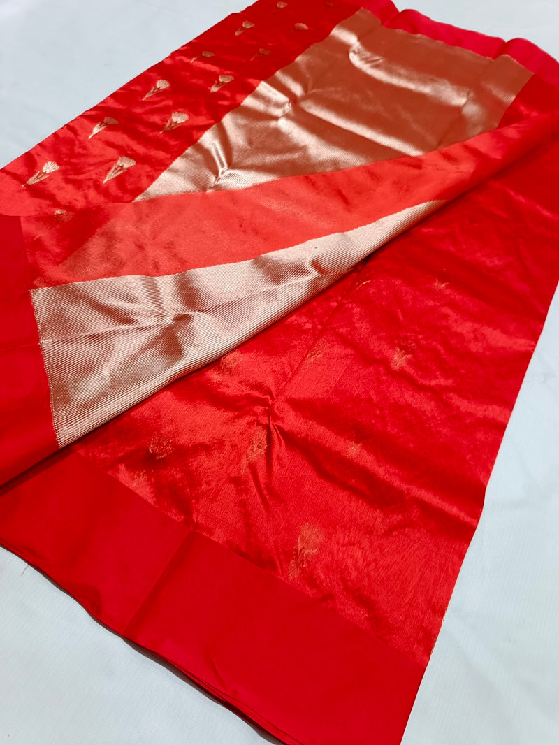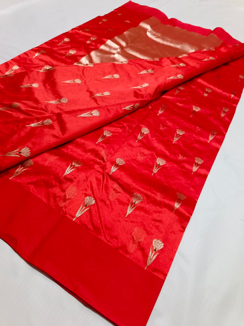 Discover refined elegance with this Designer Chanderi Pure Pattu Silk Saree, a timeless drape that blends traditional artistry with contemporary sophistication. Crafted from luxurious pure pattu silk, the saree features an all-over Minakari flower Butta design, delicately woven to reflect floral grace and heritage charm.