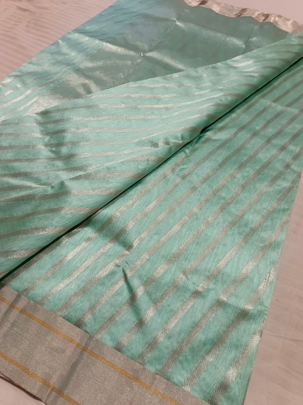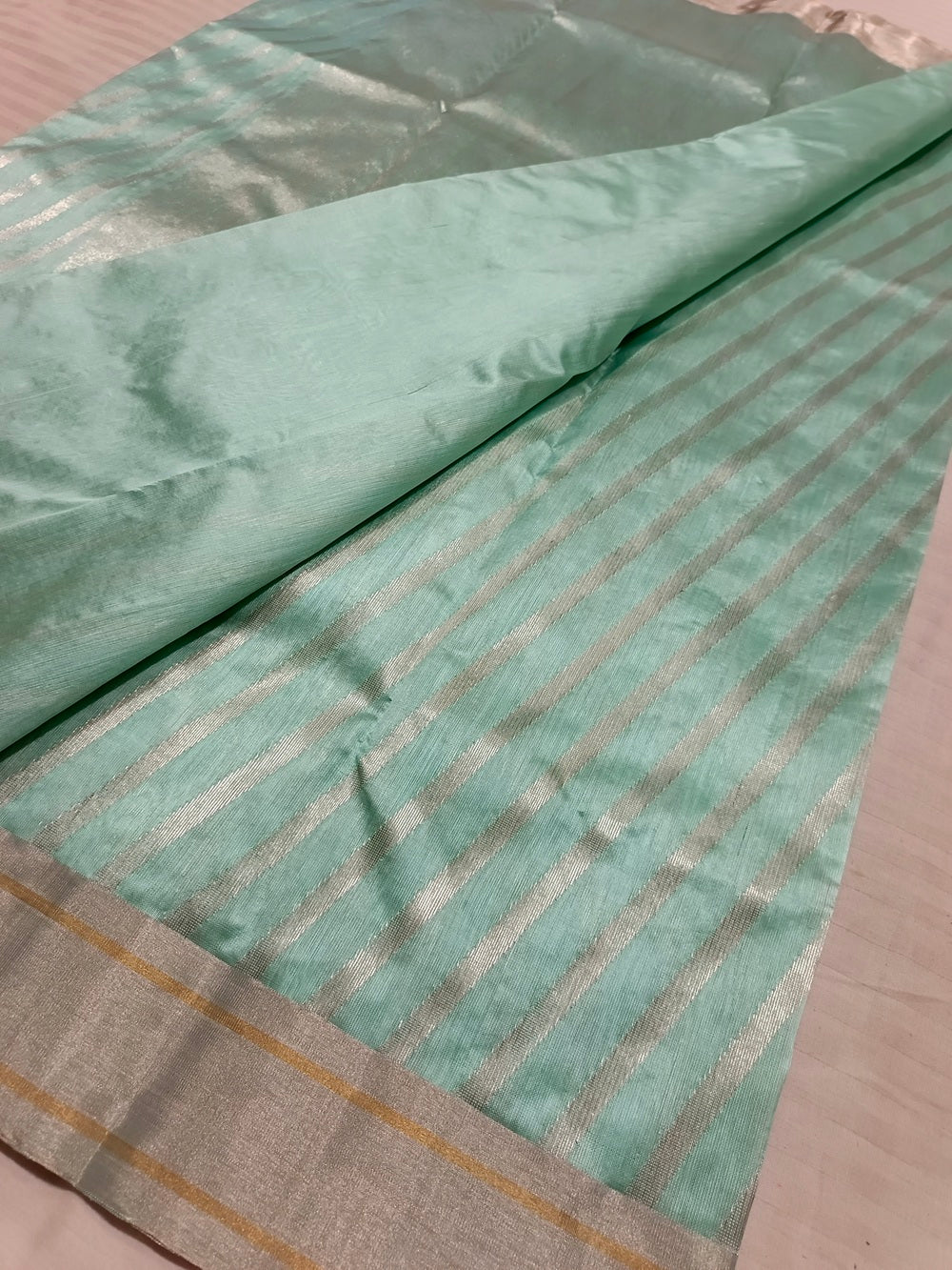 Drape yourself in timeless elegance with this exquisite Chanderi saree, woven from pure pattu silk to offer a rich, feather-light feel. The classic Lehariya design dances across the fabric in graceful waves, enhanced by the shimmer of dual-tone silver Zari that catches the light with every movement.