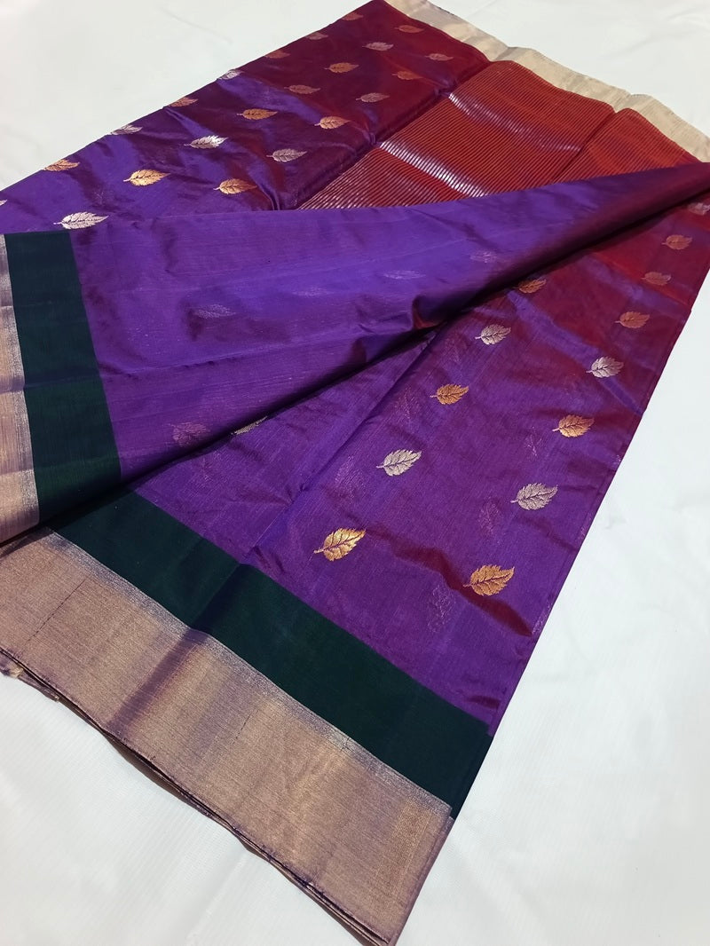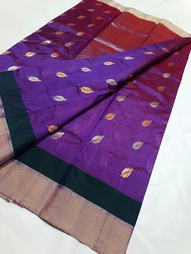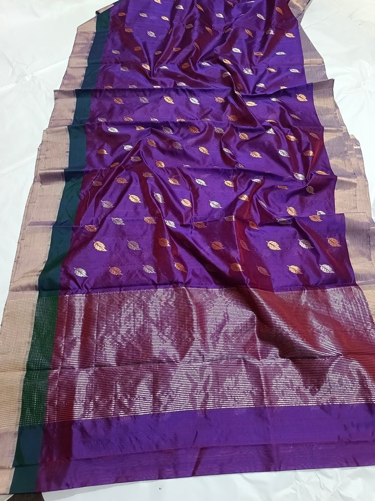 Experience timeless elegance with this Leif Designer Chanderi Pure Pattu Silk Saree, a luxurious drape that blends heritage craftsmanship with refined design. Made from premium pure pattu silk, the saree features all-over leaf Minakari buttis, intricately woven to reflect natureβs grace and artisanal finesse.
