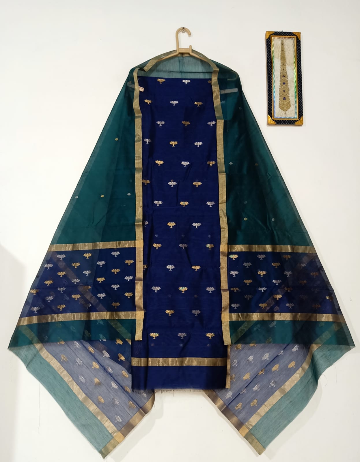 Celebrate timeless craftsmanship with this luxurious Chanderi Silk Suit Dress, woven from pure silk by cotton for a soft, breathable feel. Featuring Flower-design mini butti motifs, rich zari shimmer, and a vibrant multi-color palette, it’s perfect for festive occasions and elegant daywear.