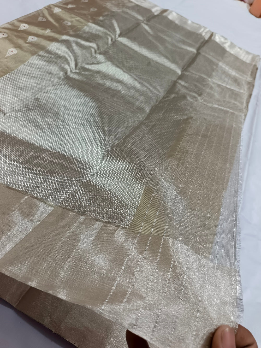 A masterpiece of intricate artistry, Minakari Naliya is woven from pure tissue silk, offering a luminous drape with ethereal grace. The saree showcases an all-over ek naliya weaving paired with minakari butta motifs, creating a delicate interplay of texture and tradition. Accented with silver zari, its elegance is further enhanced by a silver zari silk border and a zigzag taraj-style pallu that adds depth and movement.