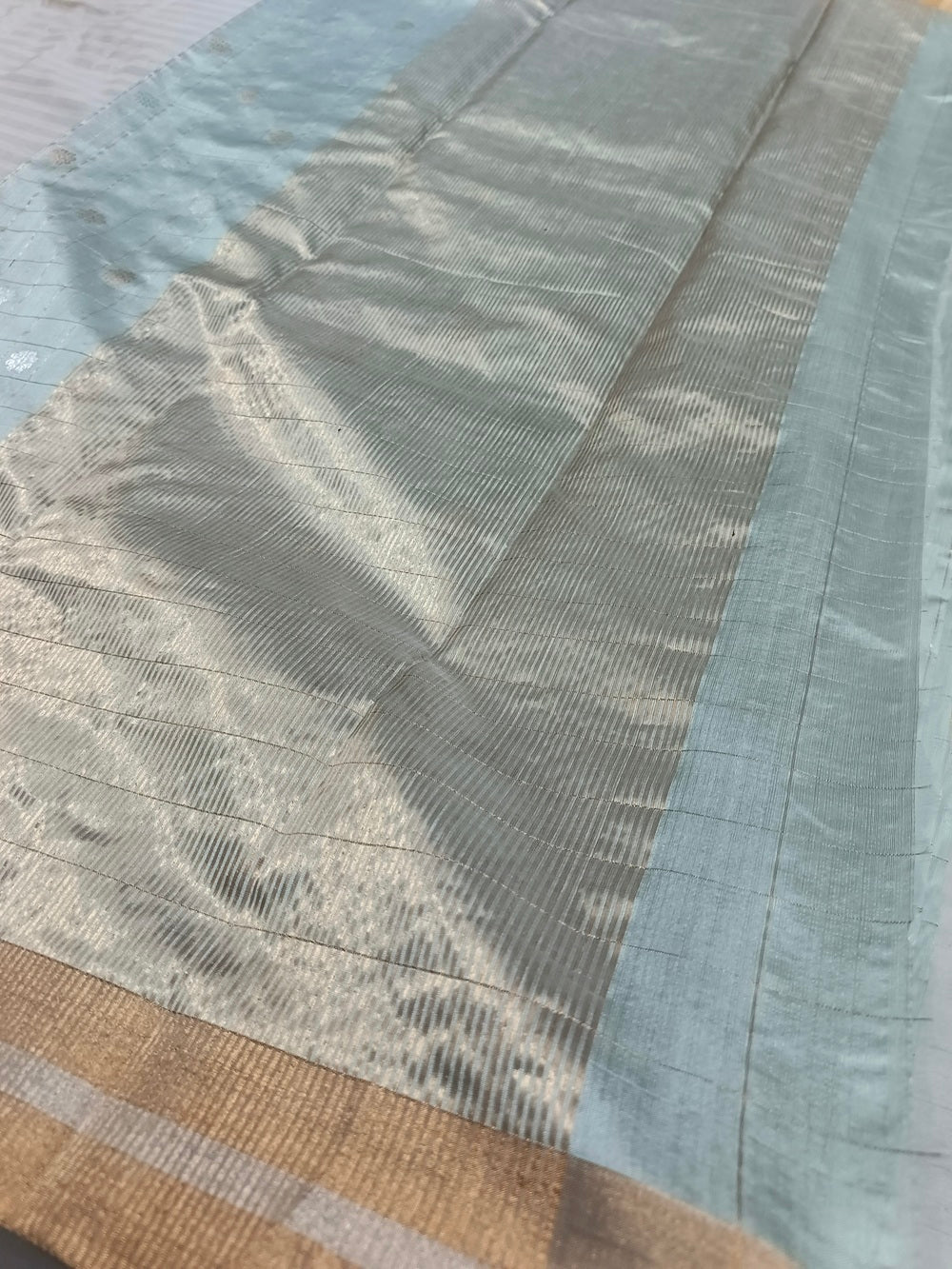 The body is adorned with shimmering Gold zari work, adding a soft, luminous touch to the fabric. A distinctive Gold zari border lends a rich contrast and textural depth, while the specific designer lehariya weaving pallu completes the ensemble with classic finesse.