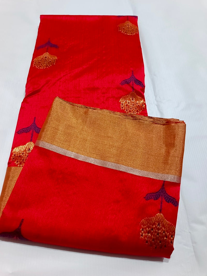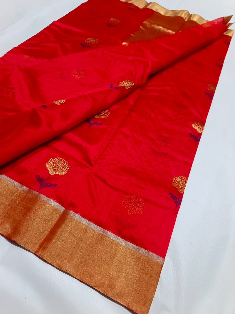 Experience timeless elegance with this flower Designer Chanderi Pure Pattu Silk Saree, a luxurious drape that blends heritage craftsmanship with refined design. Made from premium pure pattu silk, the saree features all-over flower Minakari buttis, intricately woven to reflect nature’s grace and artisanal finesse.
