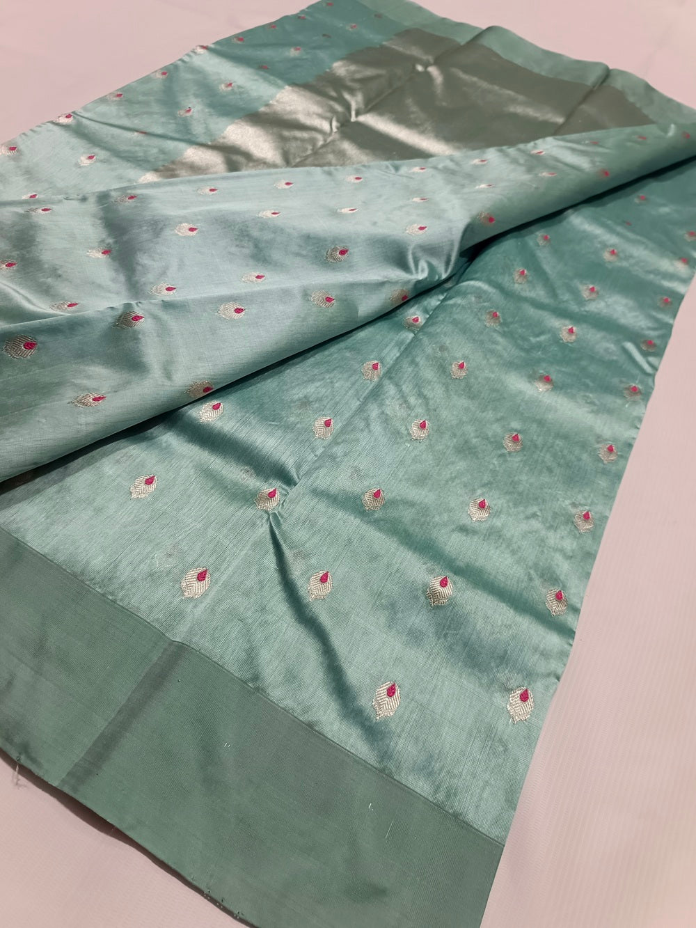 Step into timeless grace with this exquisite Chanderi pure silk saree, crafted from the finest quality silk for a luxurious drape and radiant sheen. Adorned with an all-over Ek Naliya flower Minakari butti weave, each motif blooms with delicate artistry, brought to life in shimmering silver jari.
