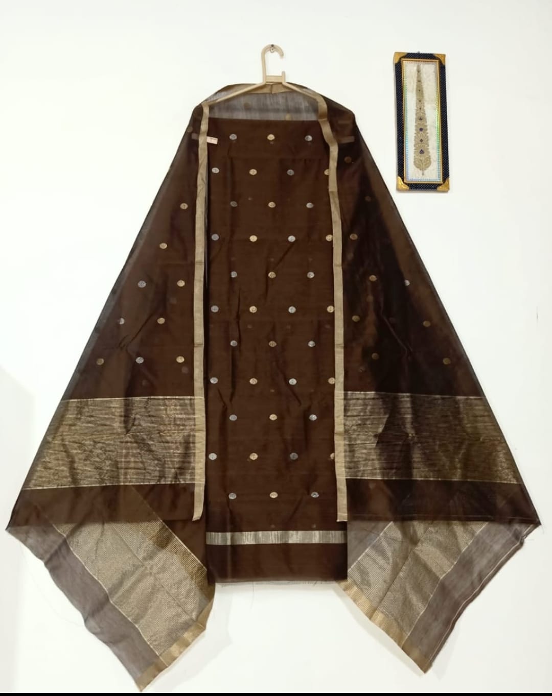 Celebrate timeless craftsmanship with this luxurious Chanderi Silk Suit Dress, woven from pure silk by cotton for a soft, breathable feel. Featuring Leaf-design mini butti motifs, rich zari shimmer, and a vibrant multi-color palette, it’s perfect for festive occasions and elegant daywear.